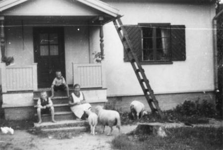 Jenny Wikholm med sina söner Kurt t.v. och Helge på trappan till familjens bostadshus. Wikholms hade egna höns och får.