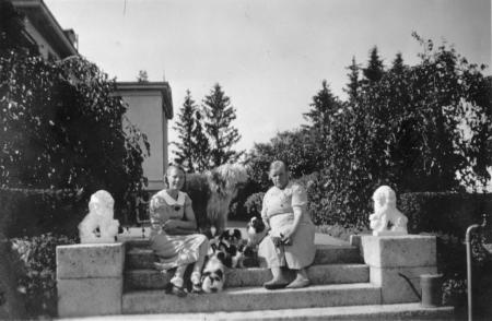 Matilda Lindfors t.h. och Doris Nyberg i trädgården på Gillobacka med herrskapet Öflunds hundar.