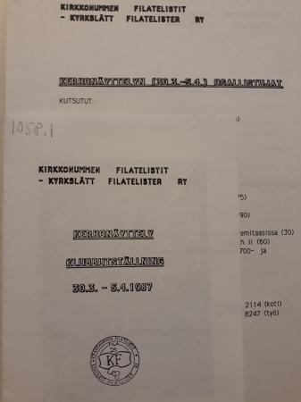 1058 Donator: Kirkkonummen Filatelistit-Kyrkslätt Filatelister. 1. Broschyr: Kerhonäyttely Klubbutställning 30.3-5.4.1987. 2. Förteckning över deltagare i klubbutställningen.
