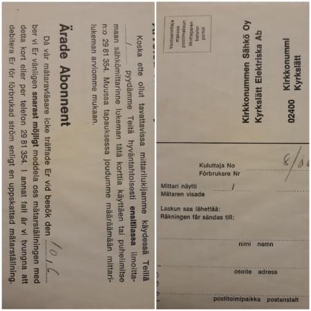 ”Arvoisa kuluttaja. Koska ette ollut tavattavissa mittarilukijamme käydessä Teillä 10/6 pyydämme Teitä hyväntahtoisesti ensitilassa ilmoittamaan sähkömittarinne lukeman tätä korttia käyttäen tai puhelimitse n:o 29 81 354. Muussa tapauksessa joudumme määräämään mittarilukeman arviomme mukaan. Kirkkonummen Sähkö Oy”