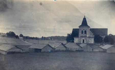 Kyrkslätts kyrka från 1200-talet och klockstapeln från 1800-talet samt kyrkstall och i bakgrunden syns prästgården.