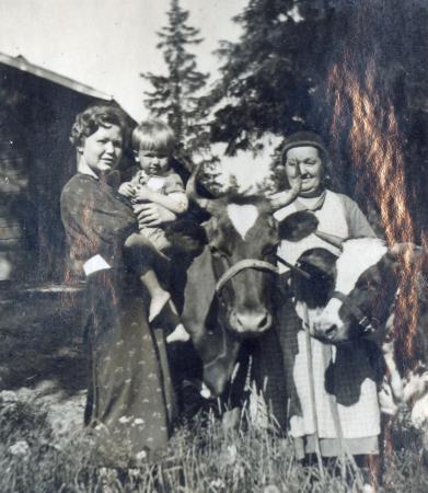 Amanda Swahn framför ladugården på Teir i Leivosböle och dottern Helmi Pahlsten med sin son Rolf.