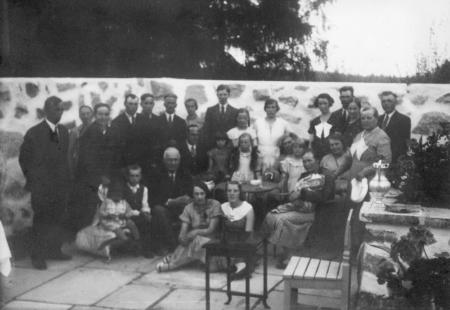 Framme i mitten sitter Lydia t.v. och Doris Nyberg, t.v. bakom Lydia sitter Oskar Öflund, bakom bordet Inga Welin med långa flätor, bakom Inga, likaså med långa flätor hennes syster Etel Welin, bakom bordet med en flicka i famnen sitter Bia Öflund. Längst t.h. står Valde Österman, t.v. om honom Matilda Lindfors, fru Ester Österman, t.v. om henne en trädgårdsmästare med sin hustru. Längst t.v. Karl Welin och hans hustru Aina Welin.