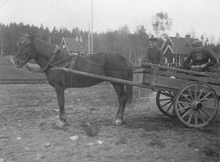 Två personer med häst och kärra invid Jorvas järnvägsstation. Kvarnvillorna i bakgrunden.