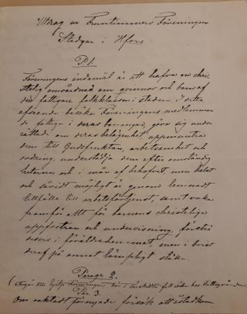 På bilden första sidan av föreningens stadgar, som tagit modell av stadgarna för Fruntimmersföreningen i Helsingfors. Texten ur bilden: