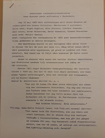 På bilden ses första sidan av den avslutande verksamhetsberättelsen från 1976 . Föreningens sista årsmöte hade hållits 1969. Efter det hade medel donerats, omkostnader betalats, minnesadresser över avlidna medlemmar skickats och föreningens historik (utgiven av Kyrkslätts hembygdsförening 1975) inköpts. Endast fyra medlemmar var vid livet 1976.