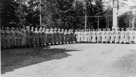 Flaggan hissas vid morgonandakten 10 maj under lottakursen i Grankulla 2-16 maj 1936.