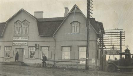 Kyrkslätt sparbank och August Gabrielssons lanthandel väster om kyrkan i Kyrkslätt.
