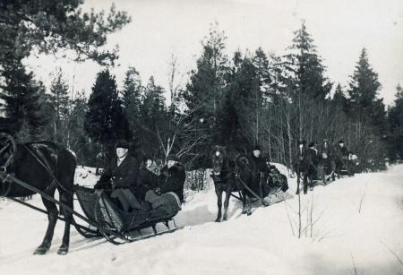 Flera hästar med släde i följd.