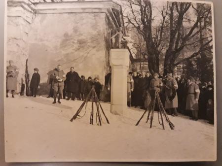 Svartvitt fotografi, uppvaktning vid Sigurdsminnesmärket framför klockstapeln. | Mv-valokuva: kunnianosoitus Sigurdsin muistomerkillä kellotapulin edessä.