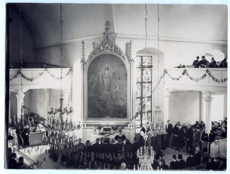 1046 Donator: Iris Falk. Ett svartvitt fotografi som föreställer nattvardsgång i Kyrkslätts kyrka antagligen omkring 1930, med prosten Julius Lindberg. Papper och digitaliserat.