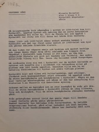 1052 Donator: Hans Lehtinen. Maskinskriven text på 8 sidor om Gesterby gård skriven av Micaela Malmsten, elev i Kyrkslätts högstadieskola. Skribenten har den 8.10.1992 intervjuat kommunens byggmästare Hans Lehtinen, som bodde på Gesterby gård och förestod museet där. Texten har sänts till Lehtinen och fanns bland hans kvarlämnade papper på museet.