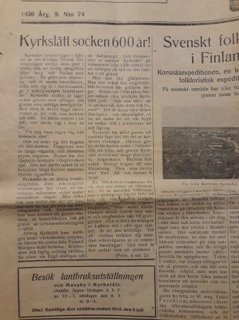1067 Donatorer: Hilding Frostells arvingar. Tryckalster. Tidningen Nyland, 5.7.1930. Adresserad till Bobäck pl., Fasa, Georg Frostell. Kyrkslätt-temanummer med anledning av Kyrkslätt sockens 600-årsjubileumsår.