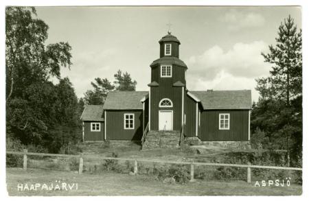 Bilden är ett odaterat vykort, troligen från ca 1930-talet, av Haapajärvi kyrka (det svenska namnet Aspsjö används knappt längre).