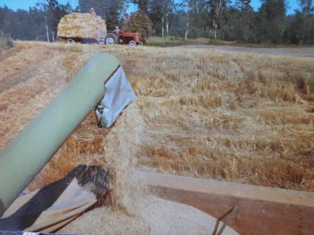 Skördad säd i skördetröskans tank håller på att tömmas i en släpvagn och i bakgrunden drar traktorn Massey Ferguson 65 halmbalar som är lastade på släpvagnen.