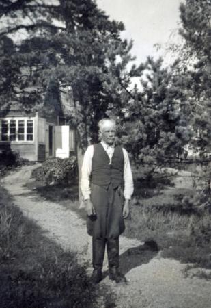 Albert Lönnberg framför sitt hem på småbruket Kalvholmen i Medvastö by i Kyrkslätt invid Björköfjärden,