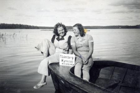 Systrarna Hjördis och Inga-Lill Lönnberg sitter på fiskebåten vid stranden till småbruket på Kalvholmen i Medvastö by i Kyrkslätt invid Björköfjärden i slutet på 1930-talet.