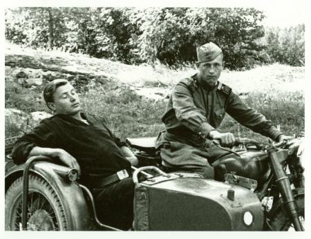 1030 Donator: fotograf Jan Kaila. Ett reprofotografi föreställande två ryska soldater på Porkala arrendeområde, på motorcykel med sidovagn.