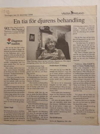 1040, arkivbildare: Vilma Österman från Hagamossa, Evitskog. Minnesanteckningar av Vilma Österman. 53 maskinskrivna sidor och ett tidningsurklipp från Västra Nyland 31.12.1998 "En tia för djurens behandling"