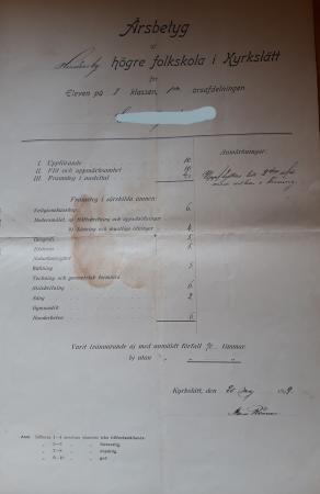 På bilden ett skolbetyg från Hindersby folkskola från våren 1899. Personen som efter första klassen fått villkor i läsning må förbli onämnd, men intressant är att man tycks ha kunnat få vitsordet 2 i sång! Man använde då vitsordsskalan 1-10, där 1-4 var ”icke tillfredsställande” (= svag, underkänd).
