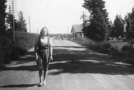Anni Edsvik på landsvägen i Gillobacka med chaufförsvillan i bakgrunden.