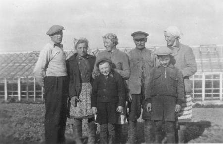 Från vänster Bror Edsvik, Inga Welin, Ada Edsvik, framför henne Kurt Wikholm, pappa Österman, Etel Bergström och framför henne Erik Welin.