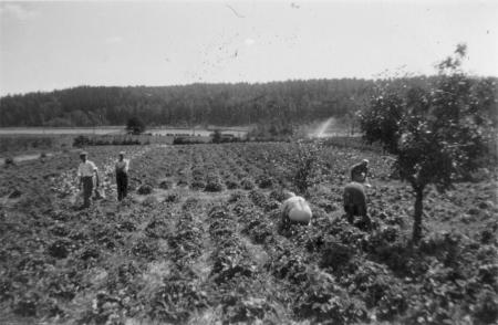 Jordgubbslandet på Gillobacka. I bakgrunden Gillobacka träsket och t.h. ses en spridare.