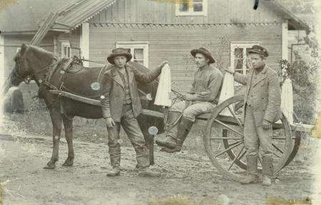Häst och kärra med körkarlar.
