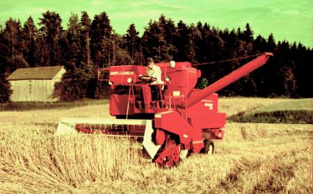 Husbonden på Thomas gård i Evitskog skördar vete på hösten 1976.