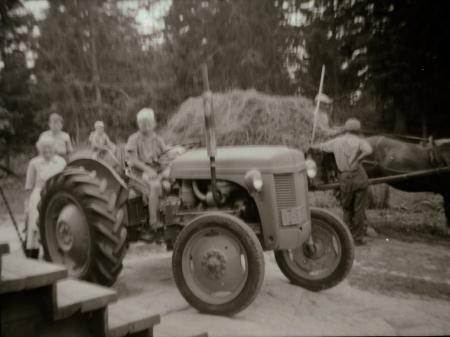 En del av folket som var på talko år 1960 och den första traktorn på Korkkulla av märket Ferguson TEF 20.
