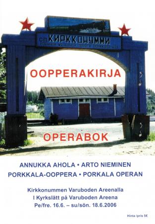 Ohjelmavihoista: ”Oopperakirja” Porkkala-oopperasta, jota esitettiin Kirkkonummella Varuboden Areenalla 16-18.6.2006. Vihossa on mm. oopperan libretto, lista mukanaolijoista ja tervehdyksiä projektin eri sidoshenkilöiltä.