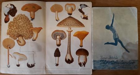 På bilden två små skrifter ur samlingen. Boken ”Våra vanligaste svenska svampar” från 1896 innehåller endast detta uppslag med bilder. 35 svamparter finns beskrivna i text. Idrottskalendern från 1931 innehåller tävlingsresultat från 1930, världsrekord, tävlingsregler, märkeskriterier, kontaktuppgifter till olika idrottsförbund mm.