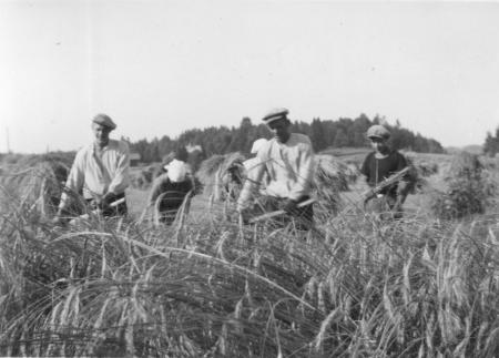 Skörd med lie på rågåkern.