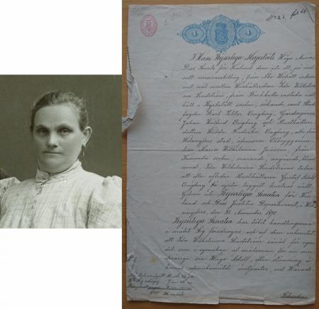 Porträttet här invid är Hugos mor Ida Lindström (1854-1918) och fotografiet längst till höger är den första sidan av fem sidor i domslutet från Åbo Hovrätt där Ida Lindström för egen del och som målsman för sonen Hugo blir officiellt erkänd som äkta hustru till den avlidne Gustaf Engberg samt då också att Hugo är deras gemensamma "äkta son och berättigad att efter honom (Gustaf Engberg) taga arv såsom barn av laggifto säng".