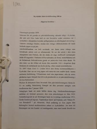 1081 Arkivbildare: Kyrkslätts jaktvårdsförening. Utprintat manuskript. ”Kyrkslätt Jaktvårdsförening 100 år - Jägarna berättar”. Manuskriptet har getts ut i tryck av Jaktvårdsföreningen. Boken saknar tryckår. (Föreningen grundades 1898.)