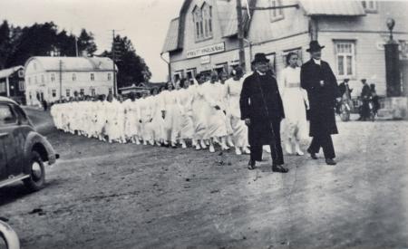 Kyrkoherden Julius Lindberg och prosten Magnus Öblom leder konfirmanderna till Kyrkslätts kyrka. I bakgrunden sockenstugan och hörngård samt Kyrkslätt Handelslag närmast.