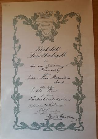 1. Diplom tilldelat Svea Malmström av Kyrkslätt Landtbruksgille för utställd handarbets-kollektion den 26 september 1903,