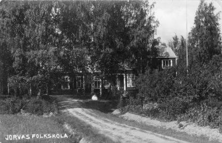 Text i nedere vänsta hörnet: Jorvas folkskola. På baksidan av postkortet finns följande handskrivna text: Linnéa Rein 19 24/4 34. För väl hållen bok. ”Synd att de rev bort den, det var en fin stockvilla”. Aina Dahlström, stickerska, bodde i småskollärarinnans bostad.