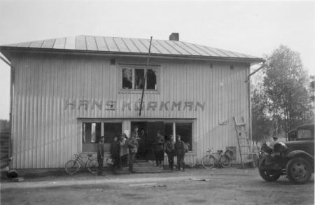 Framför butiken och på trappan står en grupp civila och några soldater.