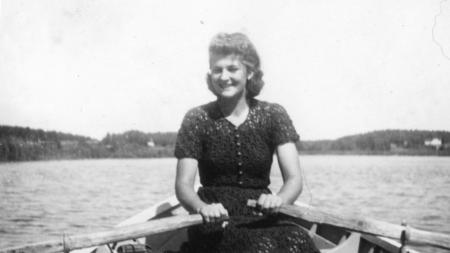 Camilla Hongell ror på Gillobacka träsket. I bakgrunden till höger är Jorvas gård.