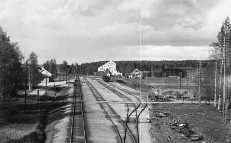 Utsikten från Jorvas bro. Järnvägen gick ända in i kvarnen. Labors kvarn och Labors kontor t.h. samt Jorvas station t.v.