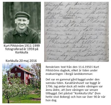 Dagboksanteckningarna från den 11.6.1950 är bl.a. om vad Ulrika Sofia Boberg hade berättat om karaktärsbyggnaden på Korkkulla som år 1950 var på Sovjetiskt arrendeområde, Porkala-området.