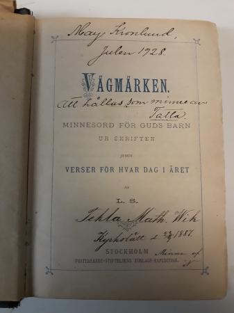 1035 Lahjoittaja: May Thärnström. Arkistonmuodostaja: Tekla Wik, kansakoulunopettaja Isak Erik Wikin tytär. Kirja ”Vägmärken, verser för hvar dag i året” (hengellisiä sanoja vuoden jokaiselle päivälle). Sisäkannessa merkintä Tekla Math. Wik Kyrkslätt d. 23/9 1887. Kirjassa on muistiinpanoja eri henkilöiden syntymäpäivistä.