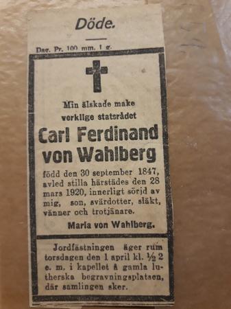 1059 Donator okänd. Dödsannons för Carl Ferdinand von Wahlberg, f. 30.9.1847, d. 28.3.1920.