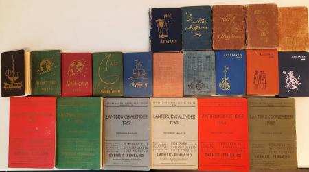 På bilden pärmarna av alla almanackor i samlingen.