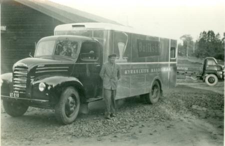 Ole Löflund bredvid bilen. Butiksbilen var en Ford Thames. Bilden är troligen tagen vid Kyrkslätts station.