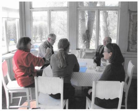 1048 Tulostettu värikuva suunnittelukokouksesta Sarfvikin kartanon kuistilta noin vuodelta 2008. Kuvassa henkilöt (vasemmalta) Lisbet Ruth, Peter Sjöstrand, Ingalill Ihrcke, Bo Lundell ja Sigbritt Backman.