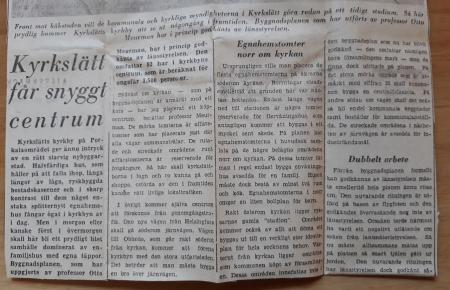 På bilden en av många artiklar ur samling 1090: ”Kyrkslätt får snyggt centrum”. Artikeln handlar om en byggnadsplan från 1959 av professor Otto Meurman för församlingens områden kring Kyrkslätts kyrka. Planen ”omfattar 82 ha av kyrkbyns centrum, som är beräknat för ca 1 500 personer.” ”Här skall bli ett prydligt litet samhälle dominerat av enfamiljshus med egna täppor.”