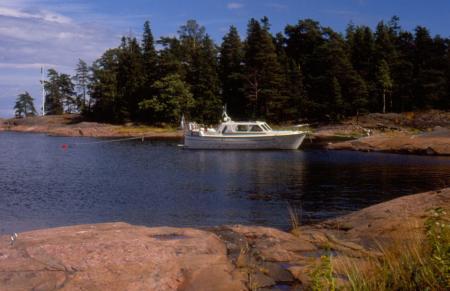 Tom Swahn med familj har förtöjt m/s Sofia vid Lilla Brändö år 1991.