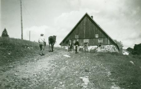 | Husbonden vid karaktärsbyggnaden | Karl Engberg med gäster vid gamla landsvägen invid Storkvis. Gästerna f.v. Gerda Sundqvist gift Häggman, Margaretha Hansen från Danmark, Selma Engberg gift Åberg, Ingeborg Engberg gift Holm och Hedvig Hansen från Danmark. | 1910 | |